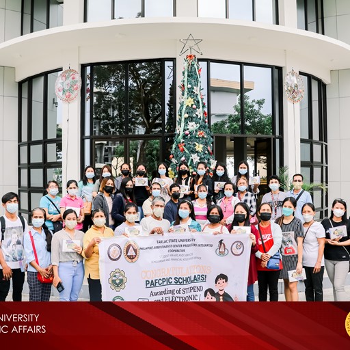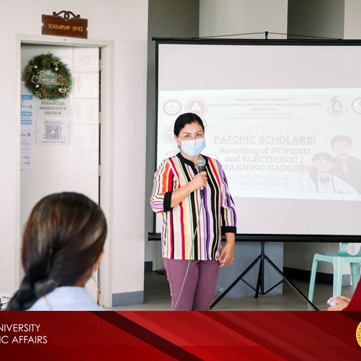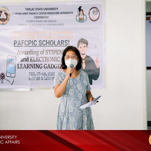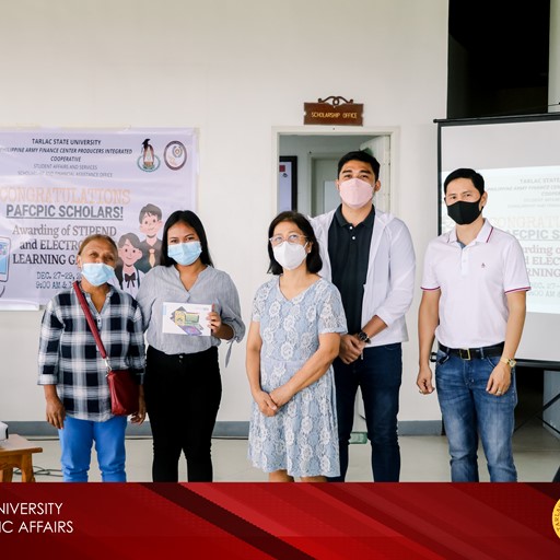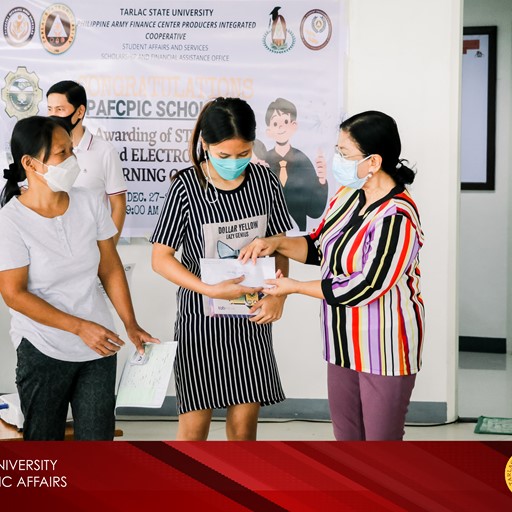 Tarlac State University through the Scholarship and Financial Assistance Unit (SFAU) awarded electronic learning gadgets and stipend to its first batch of PAFCPIC (Philippine Army Finance Center Producers Integrated Cooperative) scholars on December 27, 2021 at the Student Center Building of the Lucinda Campus.