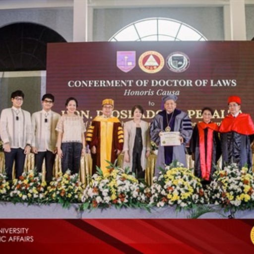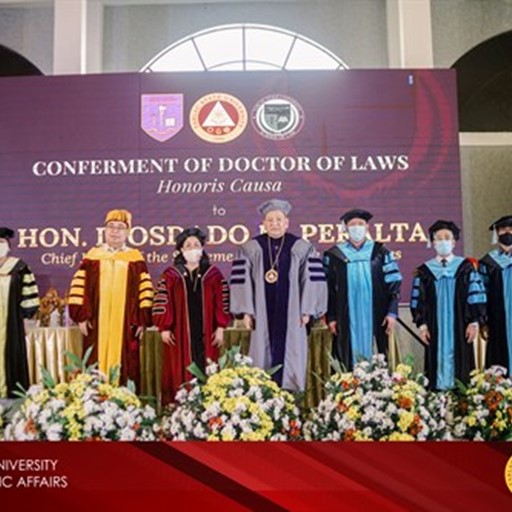 Hon. Peralta, the 26th Chief Justice, was conferred with this degree to honor his contributions to the justice system such as the declogging of court dockets, adoption of reforms that simplifies court procedures, and the promotion of a more disciplined and responsive judiciary. He is also noted for his speedy and scholarly disposition in criminal cases.